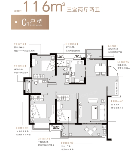 ③ 建面约115㎡,三室两厅两卫。户型面积更加宽敞,房间品质也再升一级。双阳台、大三室、三面采光,尺度尽显;双卫生间也让生活更加方便。
