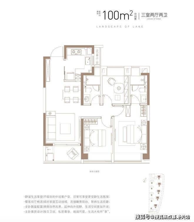 建筑面积约100㎡3房2厅2卫(中间套),全卧飘窗配置,延伸向外视野,拥抱自然风景.而大进深的阳台空间,除了可以满足基本的洗衣晾晒以外还可以日常养花喝茶,实现更多元的生活享受.