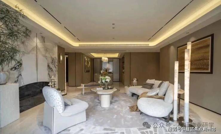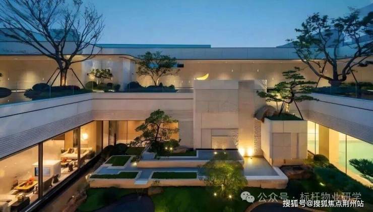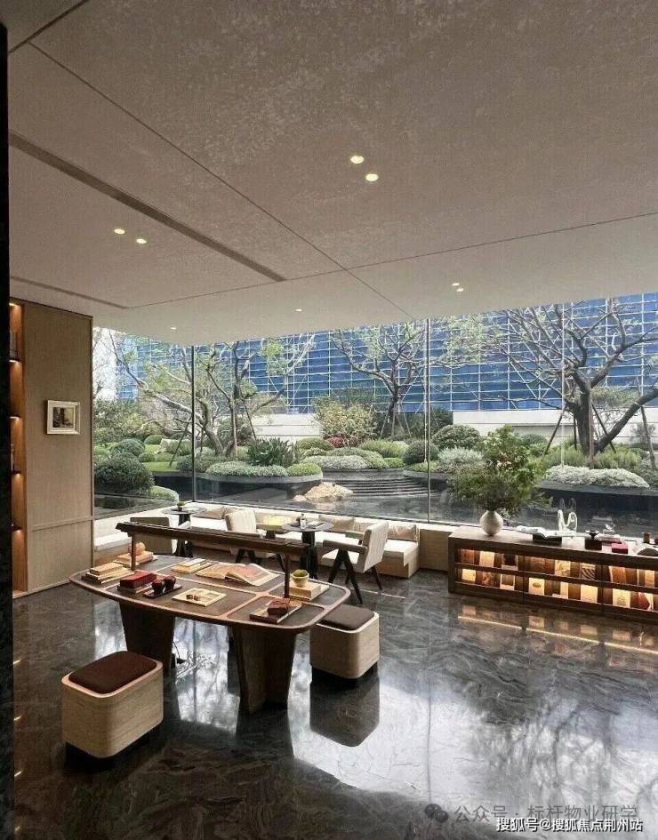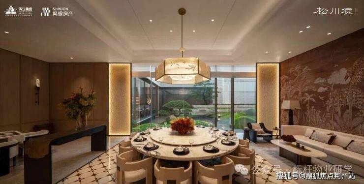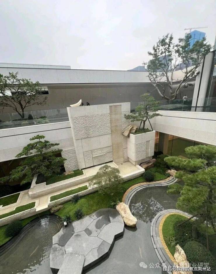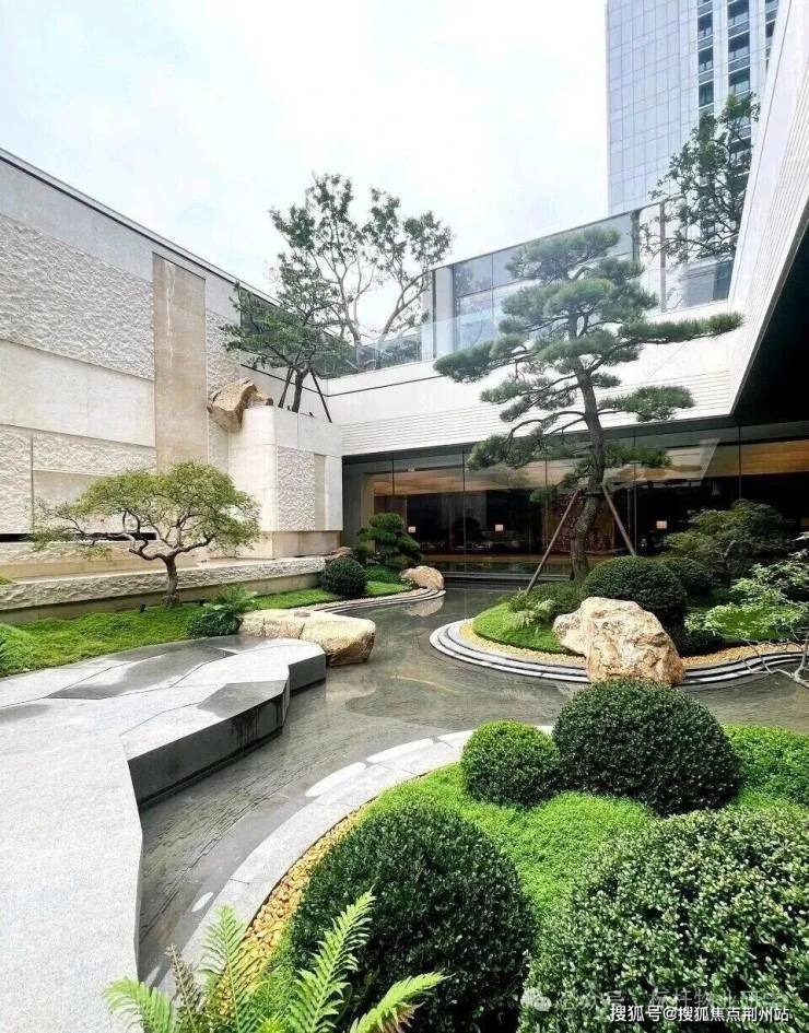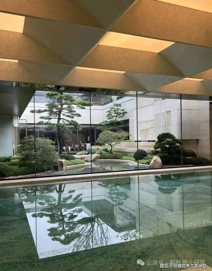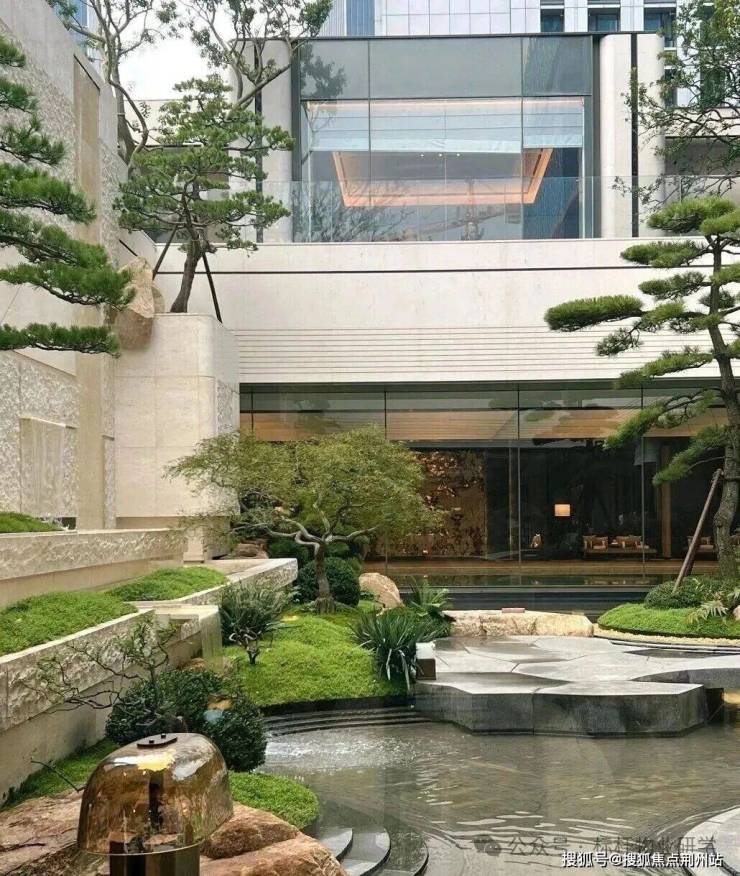 会所庭院以建筑为框,引泉植松,奢造约7米高溪山流瀑,特选6棵造型黑松.将二维的《溪山行旅图》转译为一幅“幽深与静谧、壮丽与宁静”的立体山水画卷.