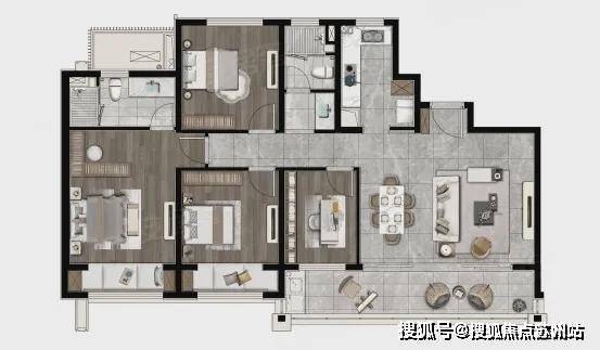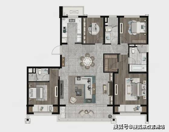 户内楼面高度不一致,错开之处有楼梯联系。但没有完全分为两层。(适合大面积住宅,小户型会显得局促)