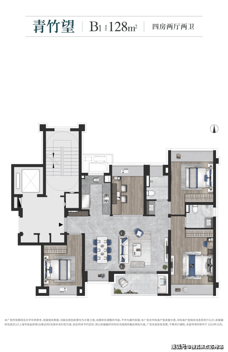 √建面约128㎡进阶四房 采用宽阔舒居的横厅设计,将餐厅、客厅、主卧、次卧平铺展开,形成横向开间的空间;四个起居室合理布局,动静分区互不干扰。