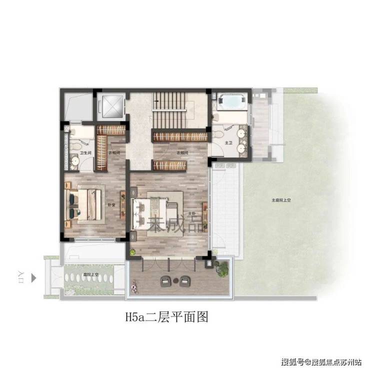 二层双卧朝南,主卧尺度奢阔,起居室→衣帽间→卫浴间层层递进。较一期新增的地上楼层露台设计,更延伸了室内的使用空间。