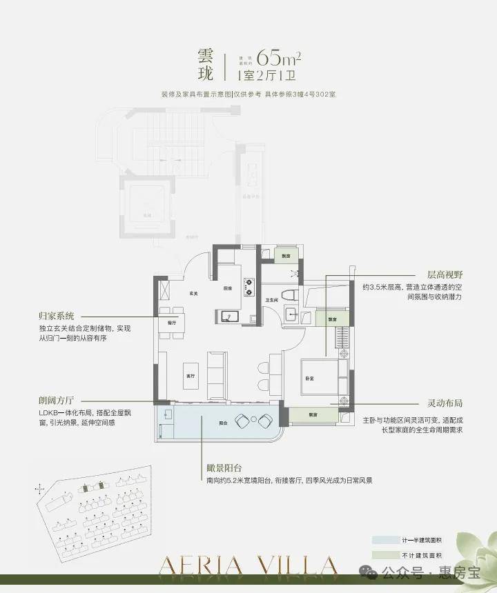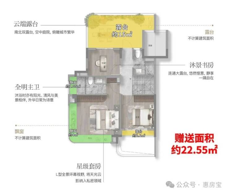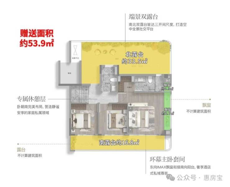 该户型附赠4个飘窗+3露台+1阳合½+挑空+闷顶等,实得率约135%!
