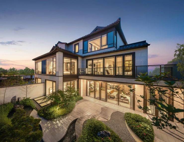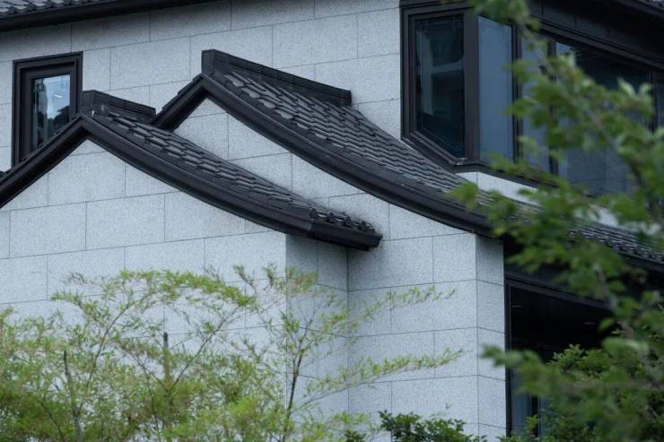 浅色石材的外立面上盖日式合瓦屋面,搭配深色金属构件,使得色彩构成冷暖有机结合,典雅简约,呈现出有时代气息的新中式建筑。歇山、硬山和小披檐等手法,丰富了建筑造型与建筑空间,与周围依山傍水的环境完美融合,组成了一幅幅画家笔下江南水乡静谧风雅的生活画卷。
