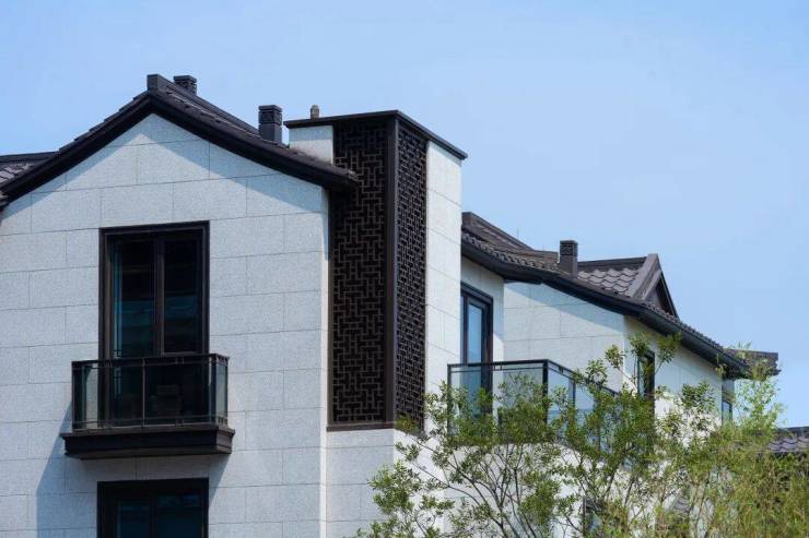 大丽和和中心中式美学院落的立面造型是在徽派基础上的当代表达,将古典建筑中粉墙黛瓦与自然景观之间形成色彩搭配与对比,结合现代风格建筑,打造形神兼备、有时代气息的新中式建筑。