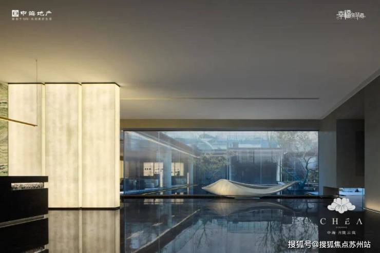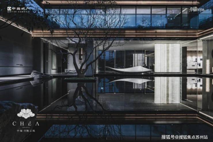这座水庭也是一整面「水镜」,将中心的乌桕树、周围的超大白玻、精致的艺术雕塑都倒映其中。