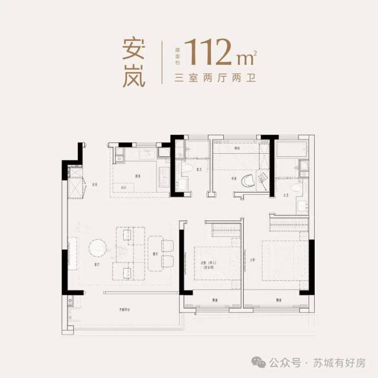 建面约 112㎡【安岚】:3 室 2 厅 2 卫,南向超大面宽,全明通透格局,LDKB 一体设计,约 5.3 米奢阔横厅,半开放厨房,套房主卧。