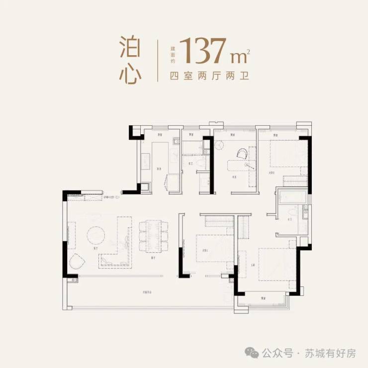 建面约 137㎡【泊心】:4 室 2 厅 2 卫,南向巨幅面宽,奢适四房尺度,IMAX 级轩阔横厅,南向跑道级宽境阳台,奢适主卧。