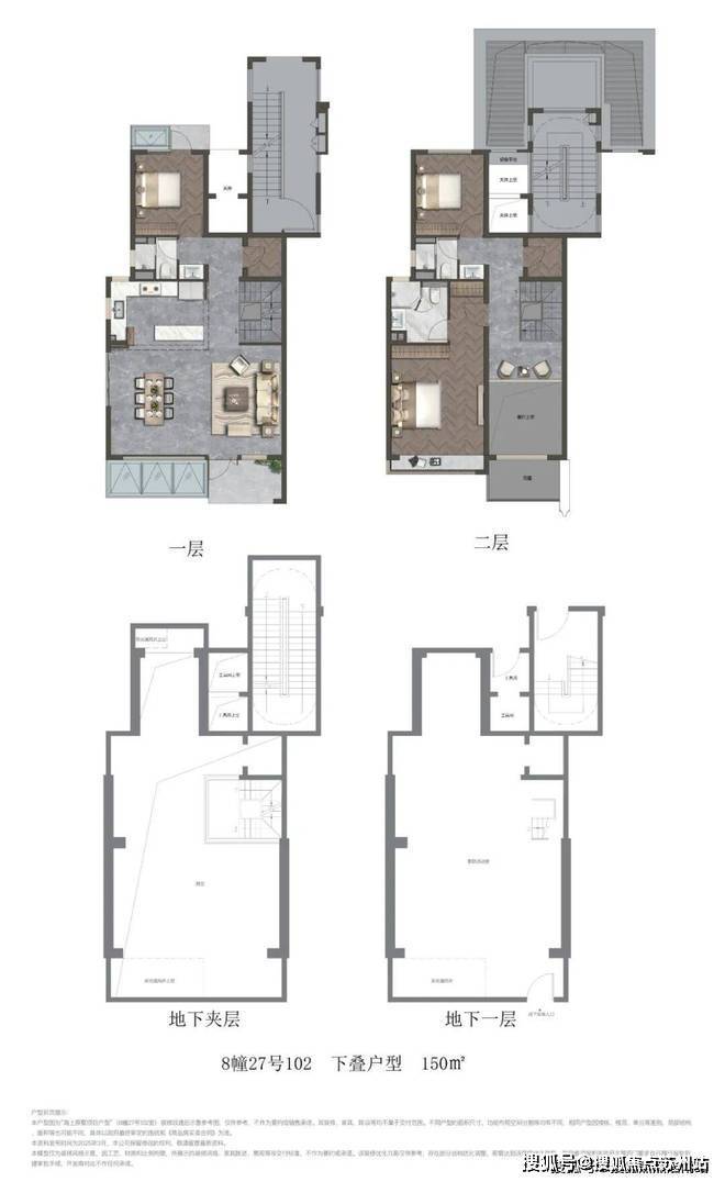 建面约150㎡下叠,一楼餐客横厅连通独立前庭,局部挑高设计,铺陈生活的礼序;二楼独立套房设计,三大卧室空间,三代同堂也能互不干扰。地下室约5.65米挑高,收藏时光馈赠的美好记忆。