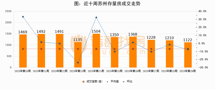 存量房方面,第29周苏州存量房成交1122套,较上周减少88套,环比下降7.3%。从近十周成交走势来看,周均成交套数为1336套,本周低于平均水平16%。