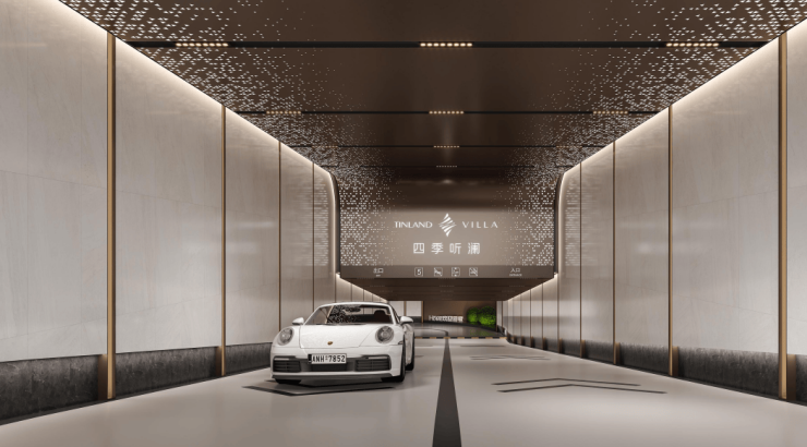 ③雅奢电梯与高配地库,尊崇感无缝衔接:电梯轿厢内,岩板、皮纹防火板与灰玻勾勒出静谧奢华;地下车库则以高定吊顶、玄关化设计与璀璨灯光,让停车时刻也充满仪式感。