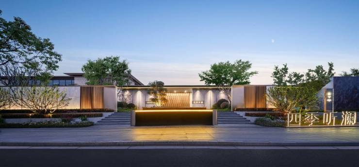 ①约37米恢弘府门,第一眼气场全开:融合东方礼序与现代线条,用仿石砖、金属格栅与灵动水景,铺就气势十足的归家序幕。