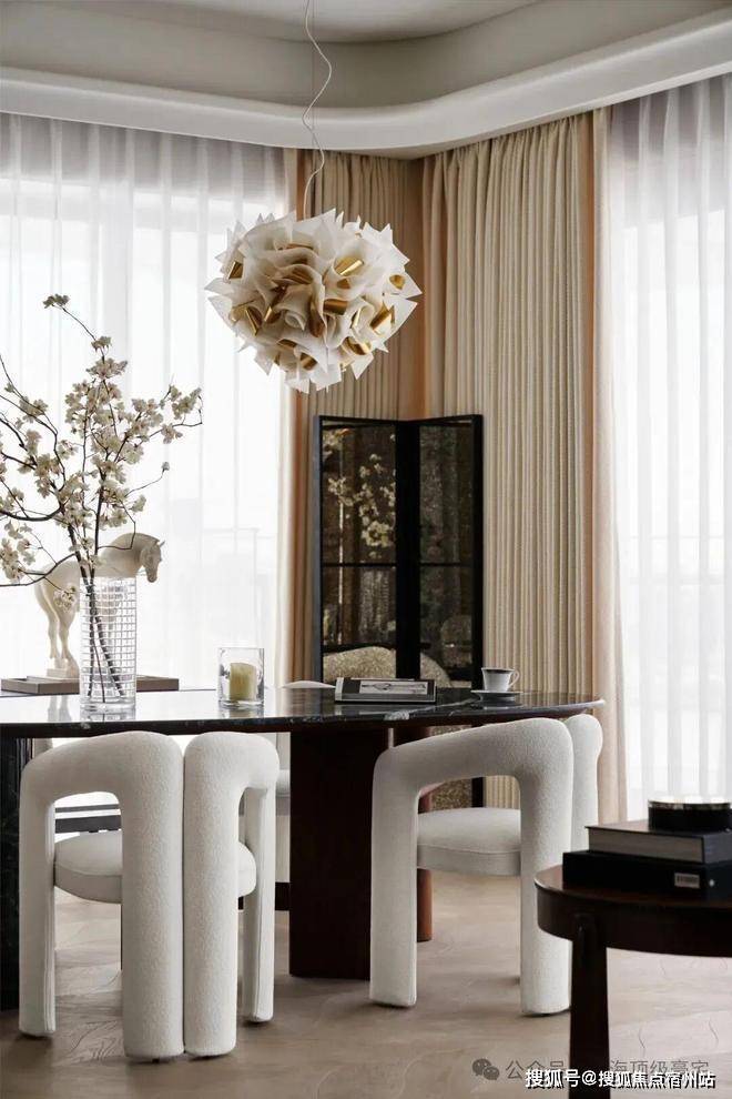 客厅空间采用大量造价昂贵的弧面设计,带来更有格调的审美价值: