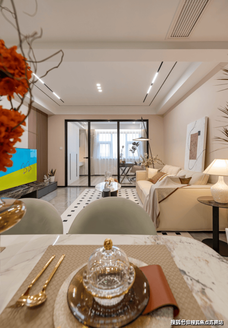 【客餐厅:温馨舒适的轻奢现代风格】客厅餐厅空间通透,串联成线,亲密互动,大金中央空调、德国威能锅炉地暖、诺贝尔品牌瓷砖