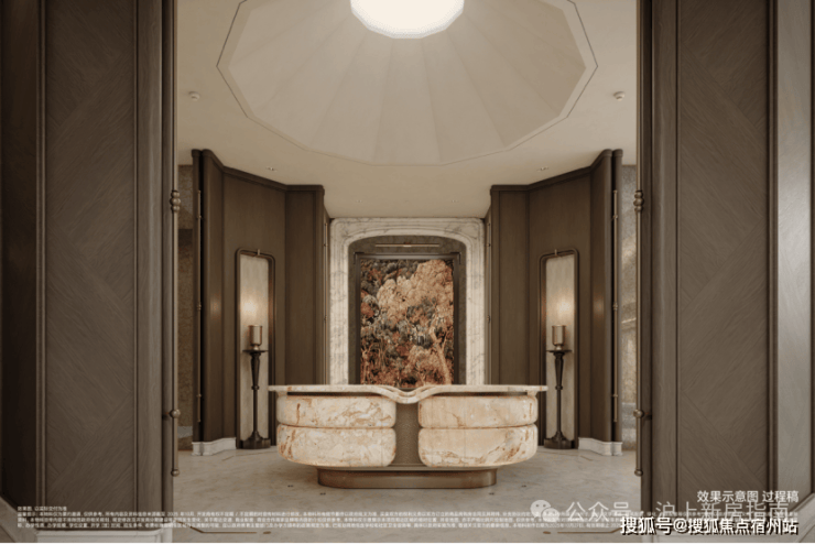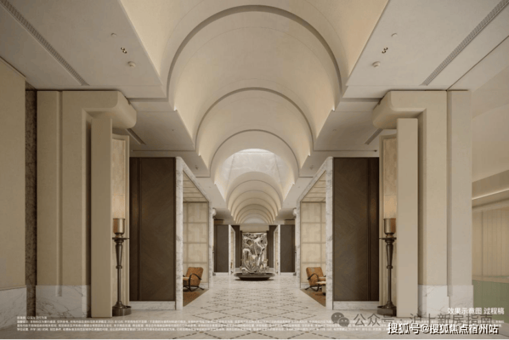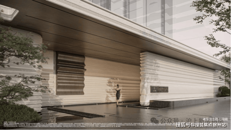 弧形仿石铝板勾勒立面层次,门厅、柱体、台面皆以柔弧过渡,不同材质成多倍投入以达最佳效果,打造温润高贵、典雅内敛的独有气质