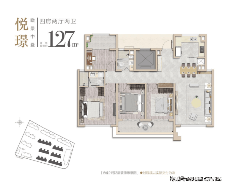 建面约127㎡四室中叠,一梯一户,四开间朝南,南向双开间超大阳台,早上在这里练瑜伽,晚上看星星,社区江南园林景观尽收眼底。