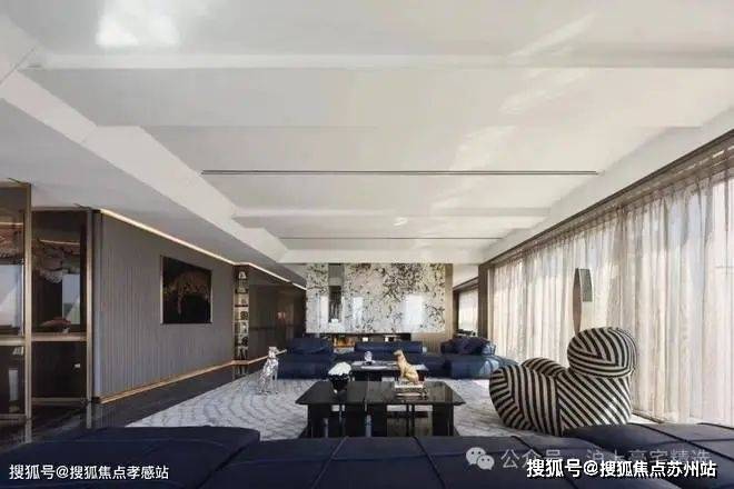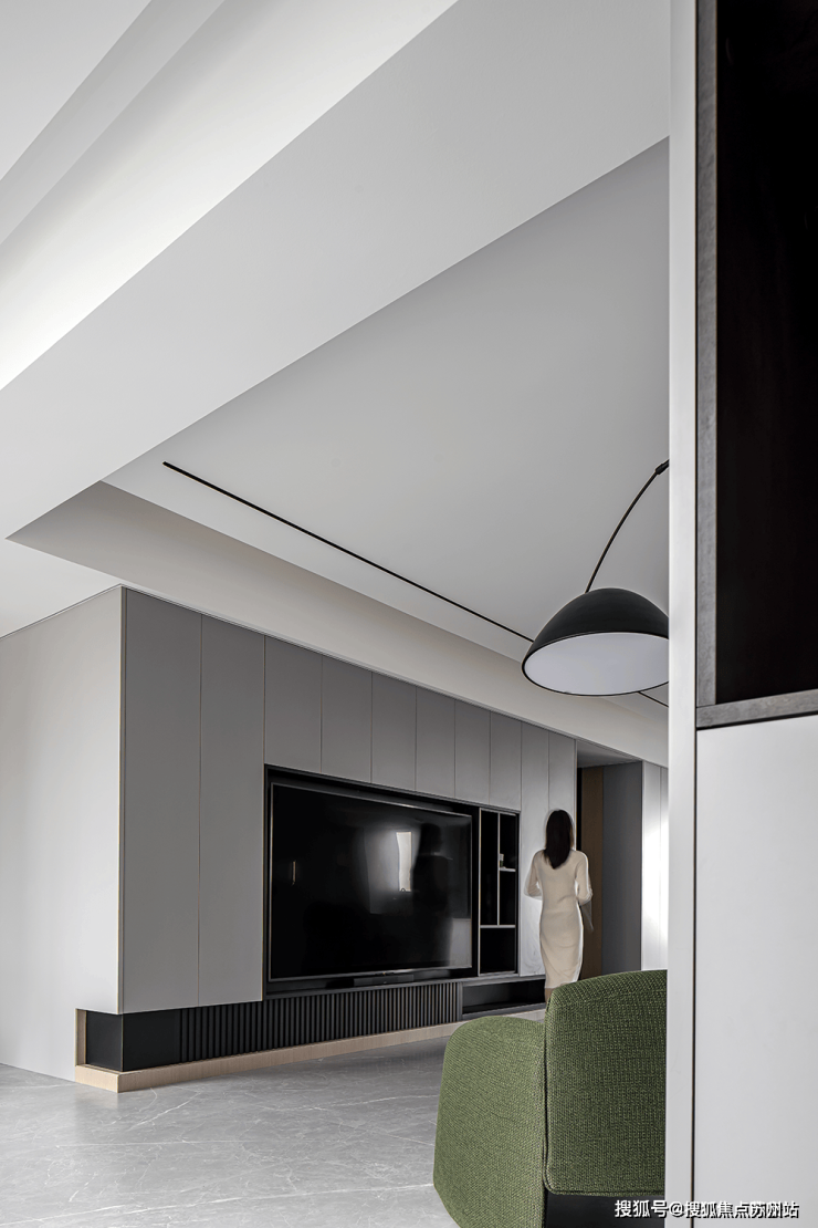 客厅吊顶采用双层设计,为空间带来层次美感。沙发墙面实用灰色软包材料装饰,金属线条进行点缀,优雅不失高级感。