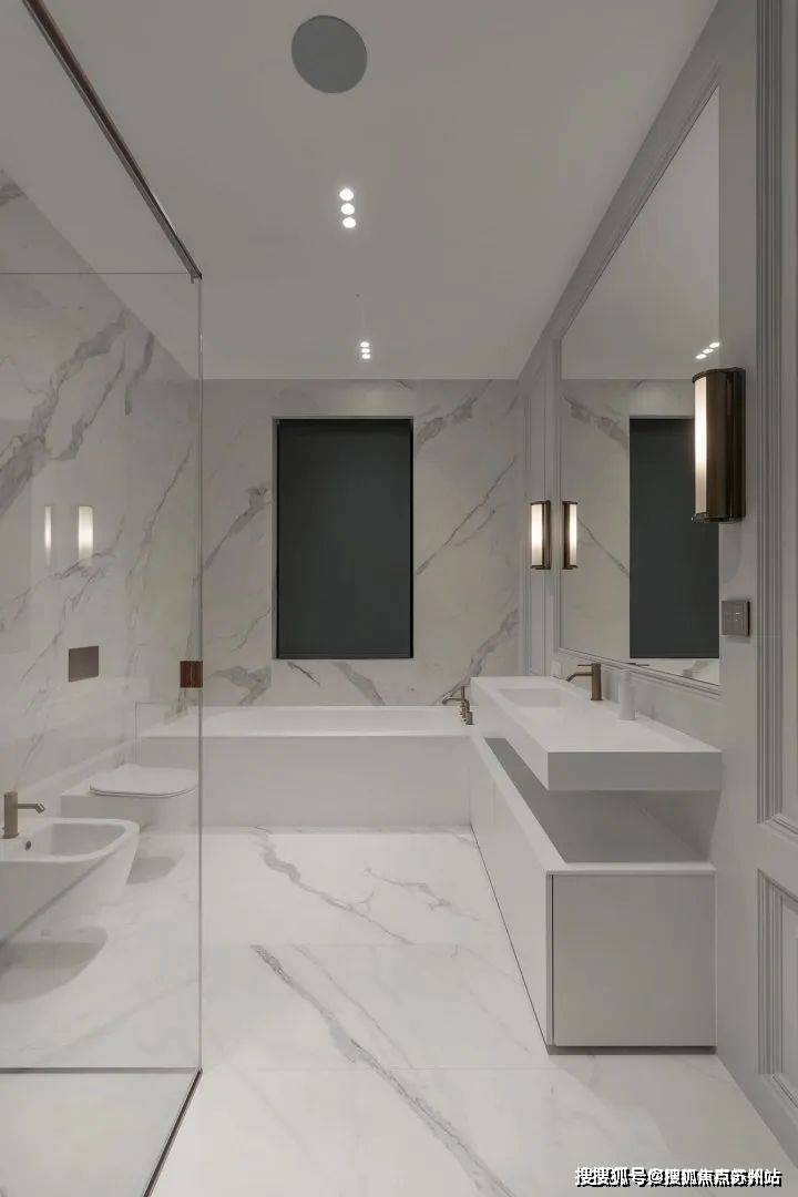 大理石地砖,玻璃墙面,石膏线装饰,