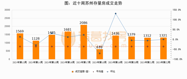 存量房方面,第22周苏州存量房成交1321套,较上周增加9套,环比上涨0.7%。从近十周成交走势来看,周均成交套数为1401套,本周低于平均水平5.7%。