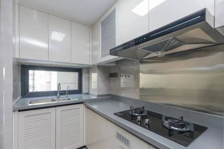 在厨房盥洗台的上方,用了一整块玻璃做推拉窗,这样既保证了充足的采光,又能将窗户上方的空间设计成橱柜,增加收纳能力。