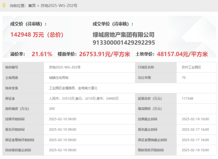 绿城沁百合,即绿城园区奥体南2号地块项目,位于工业园区金堰路西、金鸡湖大道北,是2月19日,绿城以总价142948万元竞得,成交楼面价26754元/平,溢价率21.61%。