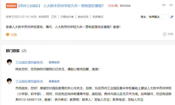 而近期,官方回复拟在苏州工业园区星华学校基础上,建设人大附中苏州学校(小学部、初中部)!