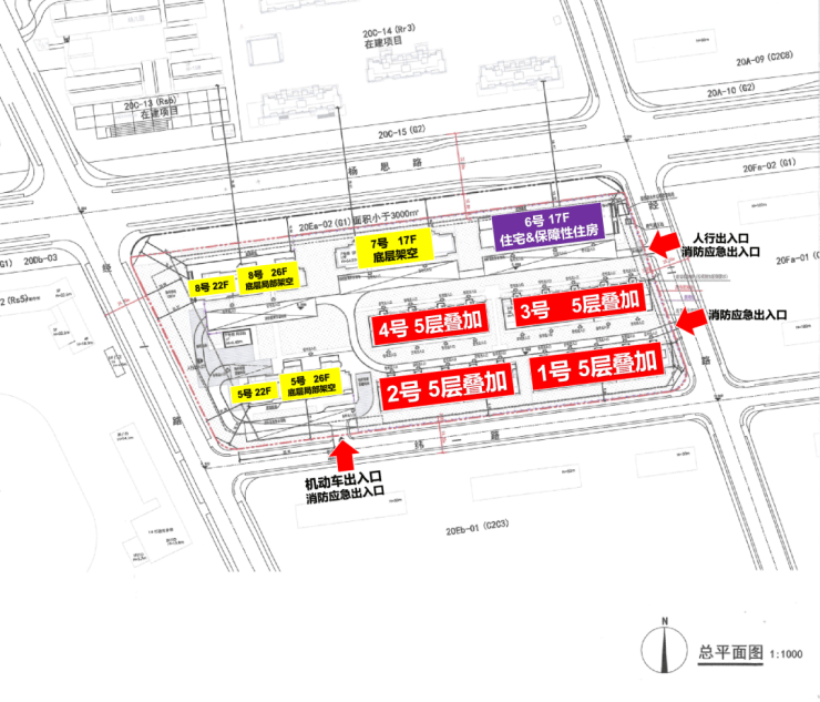 从规划方案来看,「翡雲悦府」二期楼栋的分布总体呈南低北高,东低西高的格局。东南侧分布4栋叠墅,西侧排布2栋22-26层的大高层,北侧排布2栋17层的高层,地块内保障房位于东北角。