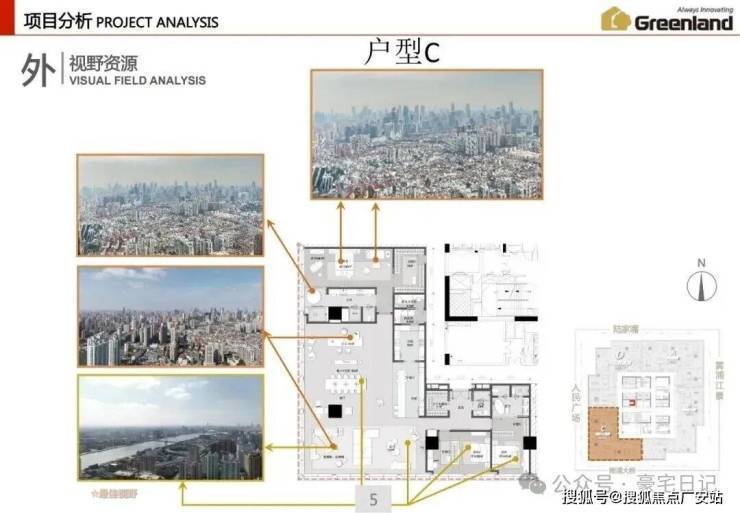 本案北视角:陆家嘴、北外滩;西视角:人民广场、新天地;东视角:浦东、黄浦江;南视角:南浦大桥、世博园.