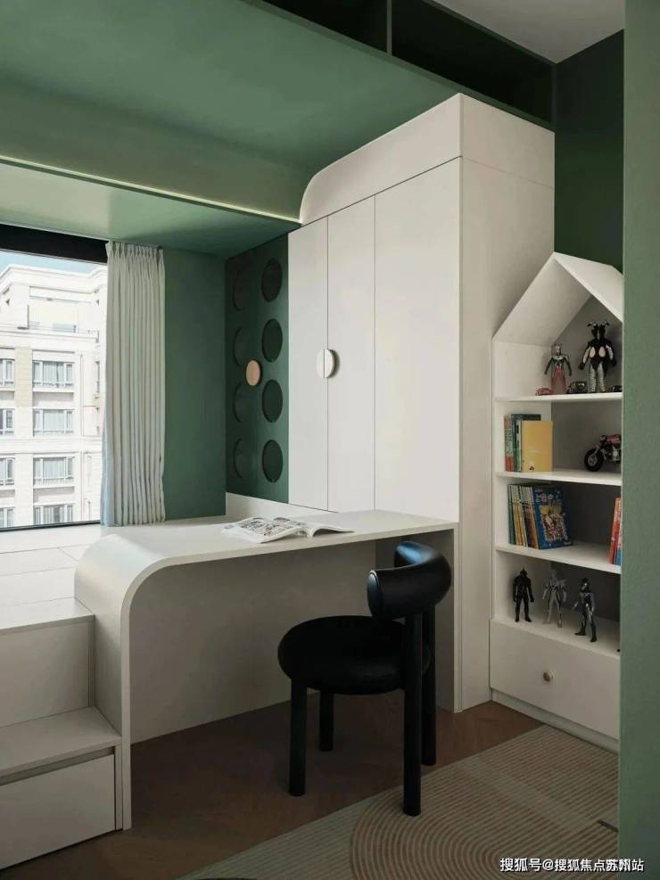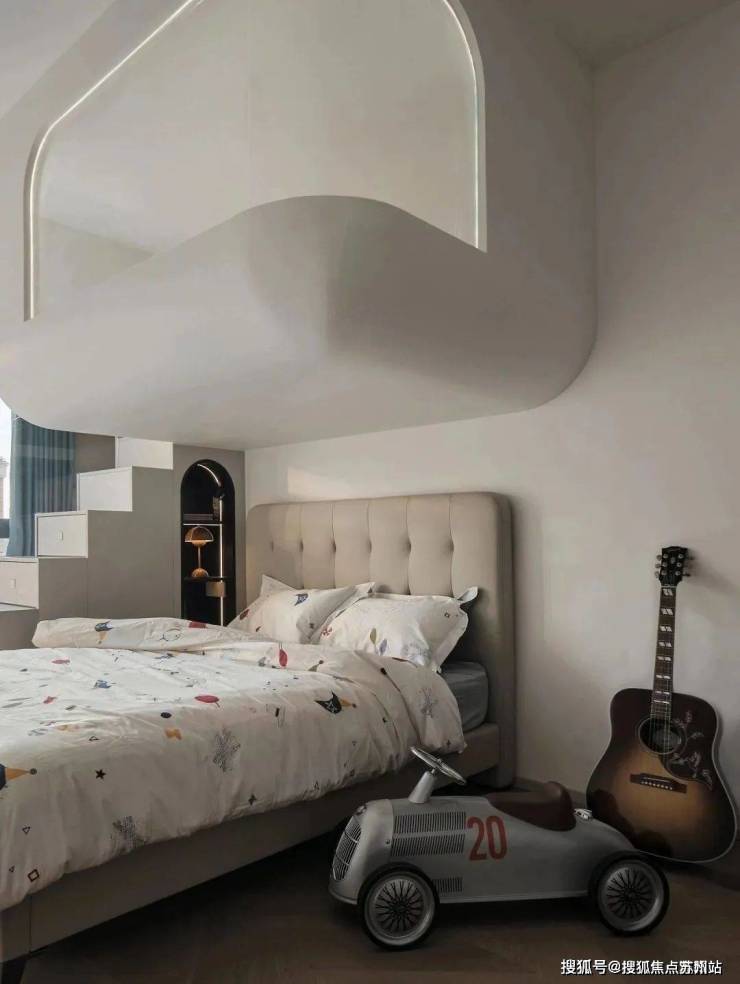 想象需要空间,童真需要守护。床体一侧设计楼梯,沿着台阶往上走,便到了孩子的小小世界。