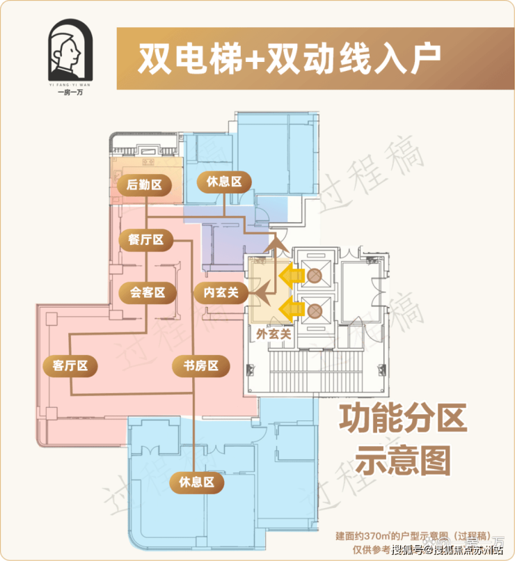 对于一层两户布局,配备两部电梯双开门有独立每一户都有独立的外玄关,让进入空间的主人和客人实现无干扰入户,并且设置了入户双动线,极致保护了隐私。