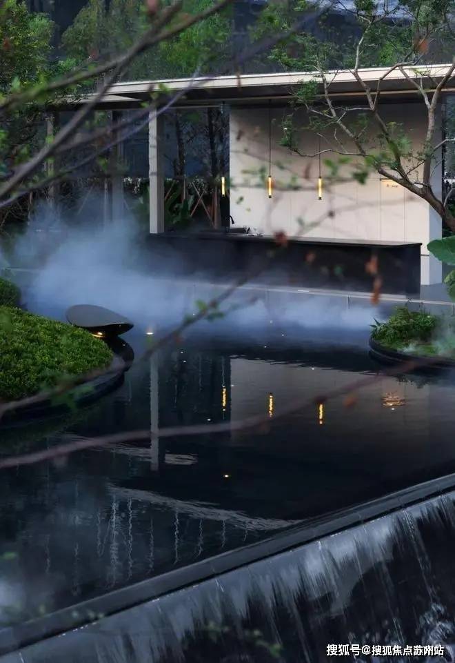 震撼瀑布水幕自建筑二层倾泄而下,伴随着轰鸣的水声与飘渺的水雾,自然而然的将建筑与园林融为一体,空灵之境悦然于心。