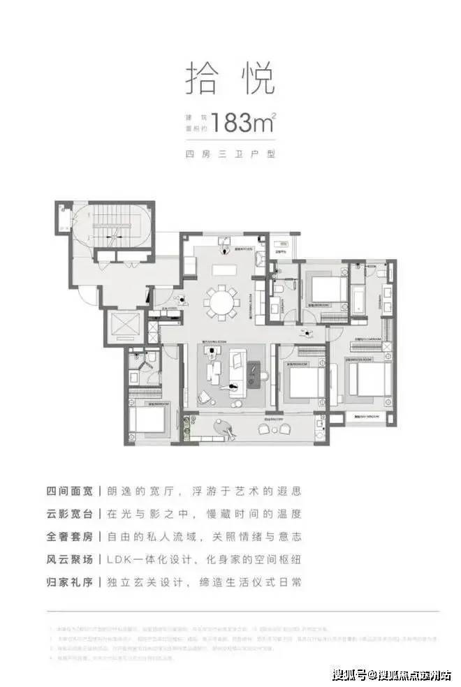拾悦:建面约182㎡,四房三卫户型