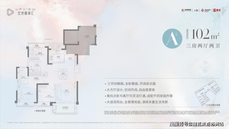 A户型是建面约102㎡3房2厅2卫,该户型 三开间朝南,「金地嘉峯汇」售楼处电话:400-867-3567(欢迎致电)采光效果上佳。 大方厅设计,空间开阔自由度更高。南向次卧和客厅可灵活打通,适配不同家庭所需; 大进深阳台+全景落地窗,让室内的通透性和视野可圈可点。