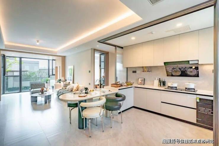 厨房移门采用大板砖厨房墙体、硅酸钙板厨房吊顶, 「金地嘉峯汇」售楼处电话:400-867-3567(欢迎致电)定制 金属移门+瓦楞玻璃,可根据需求自行开合,不仅引入更多光线,更增强了互动性。同时配备 方太 (或同等档次品牌,以实际交付为准) 油烟机和灶台、洗碗机,以及凉霸。