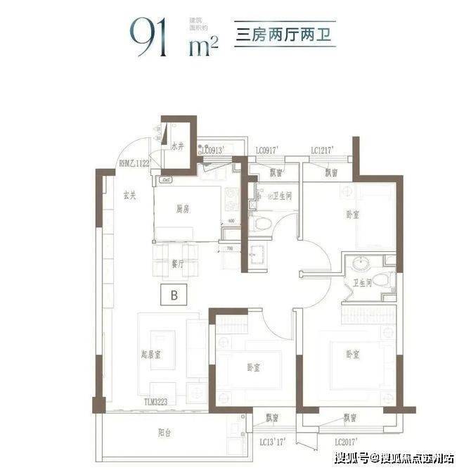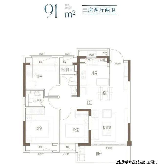 建面约91㎡3房2厅2卫▼