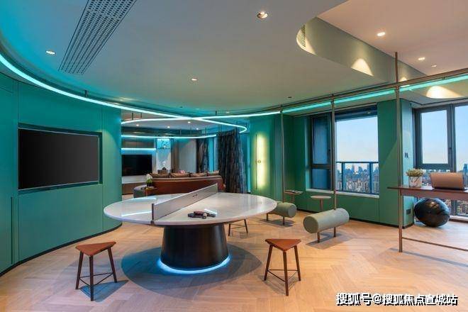 还有吧台、休闲洽谈区、共享会议和健身等功能区,是一个适合交友、会客、休憩、工作、读书、赏景的多功能空间.处处可见的时尚元素,符合当下年轻一代喜好.