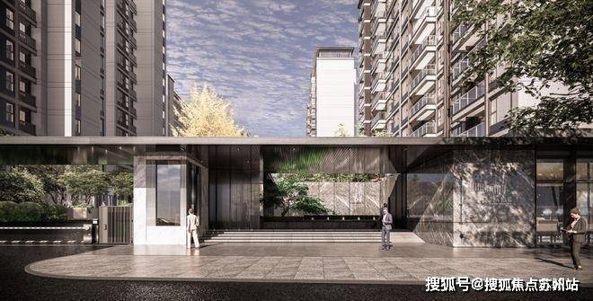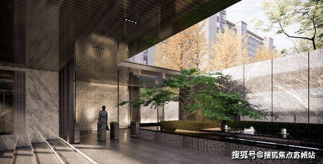 车行入口,人行入口采用石材与玻璃搭配设计,大气恢弘!门厅景观水院精致高级,入户仪式感满满!