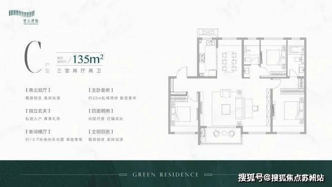 此户型可以说是改善人群非常喜欢的户型,建面约135㎡3房2厅2卫设计,动静分区,四开间朝南,各空间尺度奢阔,还有一个超大面宽的景观阳台,实现功能性和舒适度兼得.