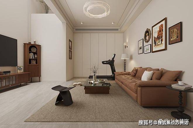 负二楼的休闲区不大,改多功能设计。沙发、茶几、电视的经典组合,围合出休闲与观影场域。角落处的高脚细腿实木柜是装饰与收纳的完美融合,胡桃木的材质引入法式复古的气息。绿宝园·翡梵24小时vip热线☎:400-8787-554