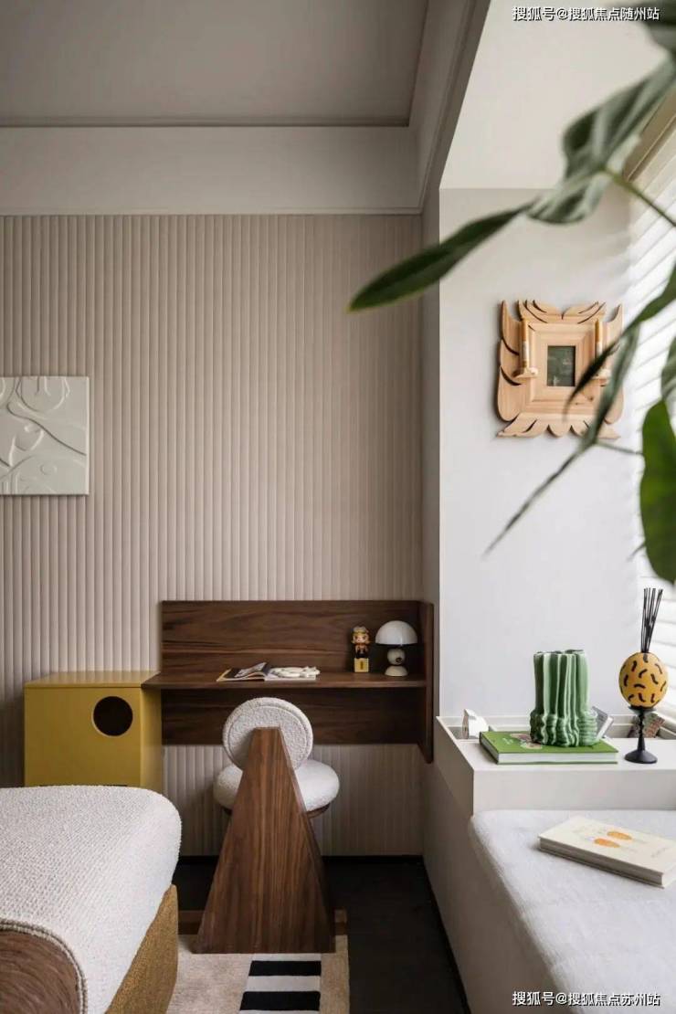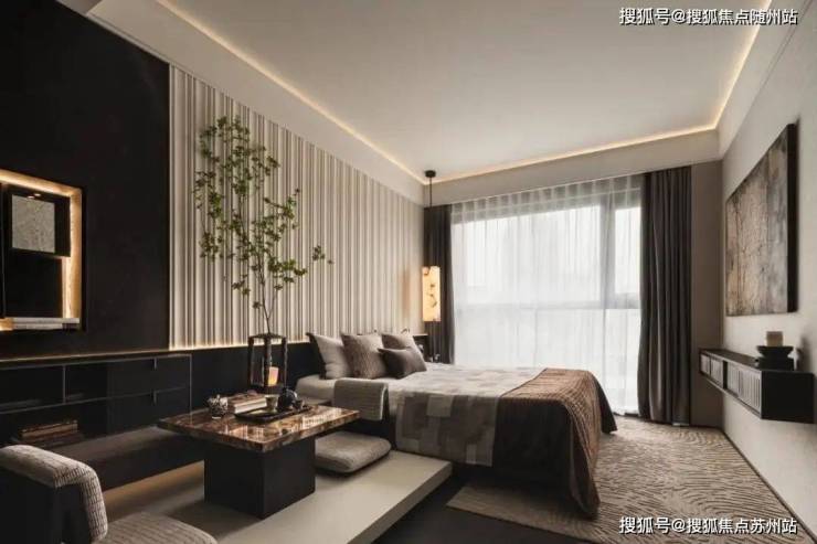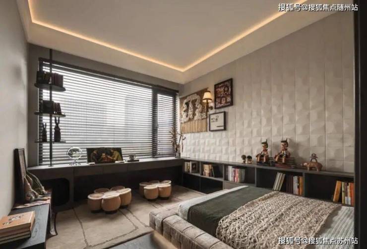 主卧是一个有着大窗的舒适空间。色调延用了客餐厅的基础色调,造型各异的灯具为整体空间带来温暖与舒适之感。黑白、深深浅浅的棕色以及红棕色拥有复古简约的魅力,但奇妙在于其中各种纹路的集合,碰撞出高级隐匿的艺术感。