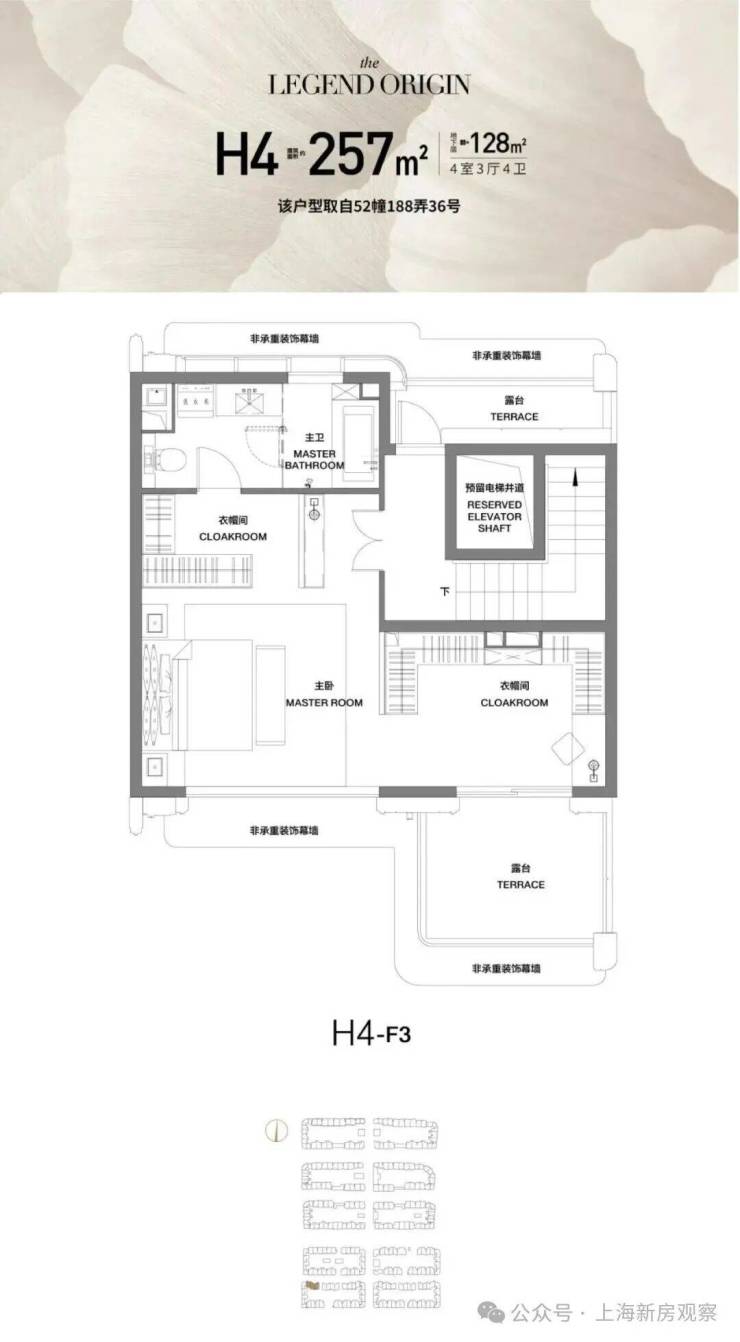 三楼主人层:媲美五星级酒店行政套房的顶层空间,以“超大衣帽间+休息区+四分离卫浴+露台观景区”进阶主人至高享乐。移步环幕露台,无可复制的多面瞰景视界,将百年街区胜景与自然诗意私藏。