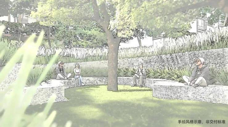 项目保留了原生在地的香樟,在地块间打造香樟聚场,这些公共绿化将三个地块串联为一座有活力的城市单元。