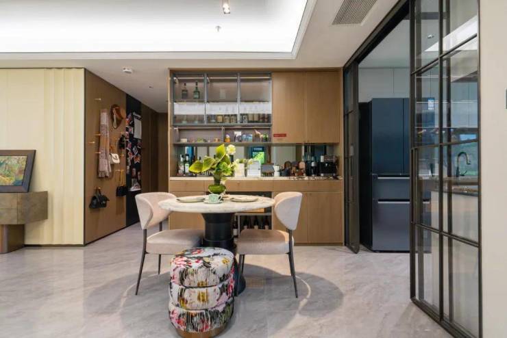从进门开始,到餐厅旁边的日咖夜酒吧台,都被设计成了储物空间。