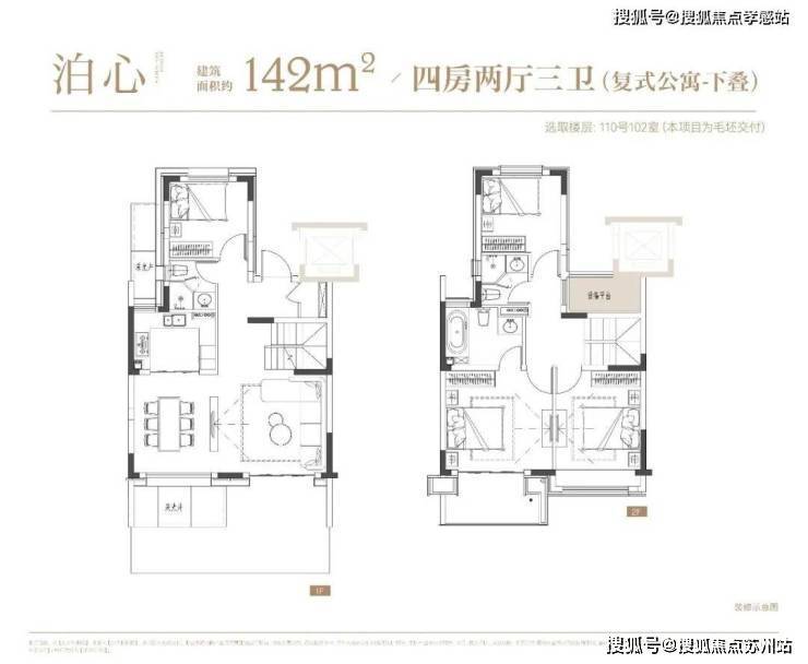 上叠户型4房2厅3卫,三层会客区,四层居住区,阳台+露台+飘窗设计,附加空间非常大,在别墅类产品中实属罕见!