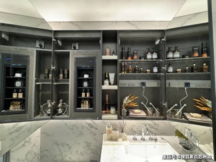 双卫配置,其中一个做了干湿分离,科勒台盆+双智能马桶,除雾镜柜均内置了牙刷消毒器、预留吹风机插座。主卫镜柜还有美妆冰箱,收纳空间相当充足。