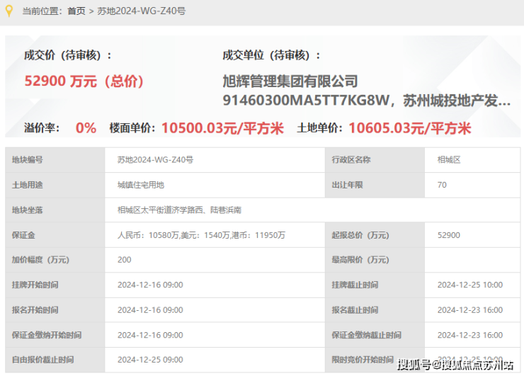 熙和·雲启观棠,即,苏地2024-WG-Z40号,位于相城区太平街道济学路西、陆巷浜南,是2024年12月25日,城投地产&旭辉&太平城乡一体化以底价52900万元竞得,成交楼面价10500元/平。