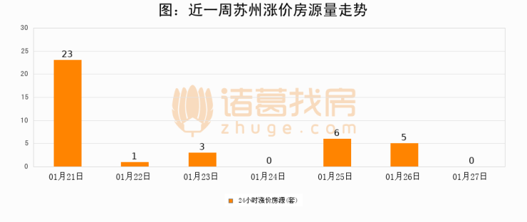 根据诸葛找房数据显示,苏州24小时涨价房源量为0套,较01月26日减少5套,环比下降100%。与此同时,涨价房源占比小幅回落,对于购房者来说是一个入市窗口期,购房者可抓住时机入市。