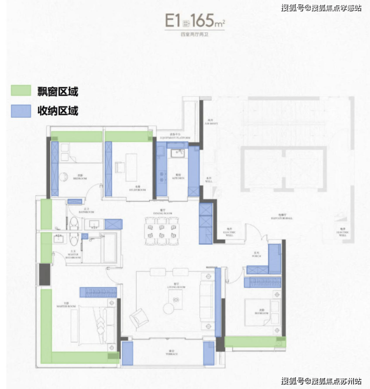 下图蓝色为收纳区域,绿色部分即飘窗区域: