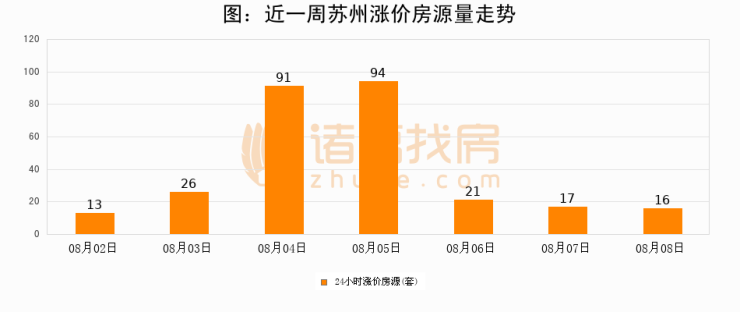 根据诸葛找房数据显示,苏州24小时涨价房源量为16套,较08月07日减少1套,环比下降5.9%。与此同时,涨价房源占比小幅回落,对于购房者来说是一个入市窗口期,购房者可抓住时机入市。