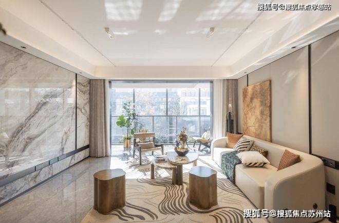 整体大面宽客厅,以岩板背景墙作为点缀装饰,弧形吊顶,造型别致,空间品质大幅提升: